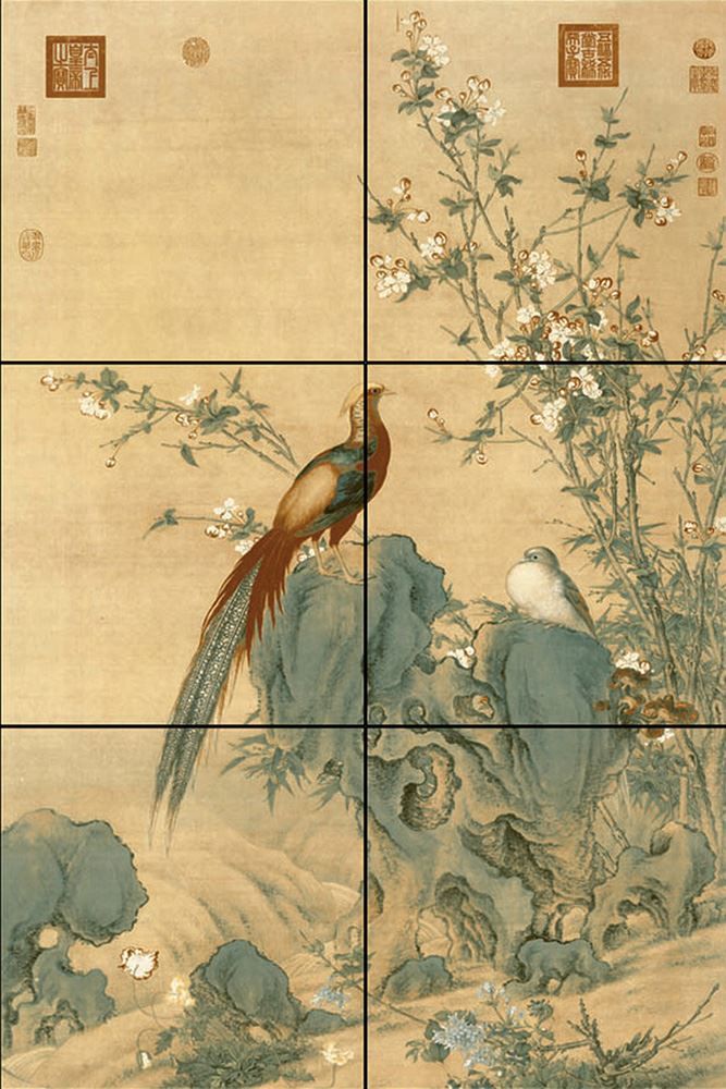 公元1742年,郎世寧特別繪製並呈獻給乾隆皇帝的壽誕禦禮。色澤濃豔的錦雞亭立於太湖石上,小溪回流其間,草坡上群芳競放。畫作色彩豔麗又極富層次立體感,畫麵雅而不俗,足見技藝超群。錦雞為祥瑞之鳥,尤其雄錦雞通身充滿富貴華麗的意向,為富貴祥和之鳥,寓意前程似錦,是高貴不凡與雍容華貴的藝術再現。青青草原网址藝術瓷運用特殊陶瓷技術複刻乾隆賀壽佳作。