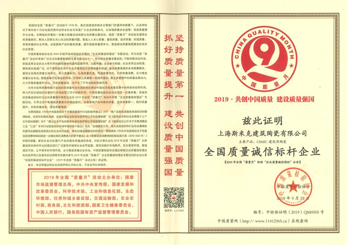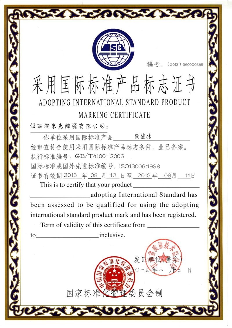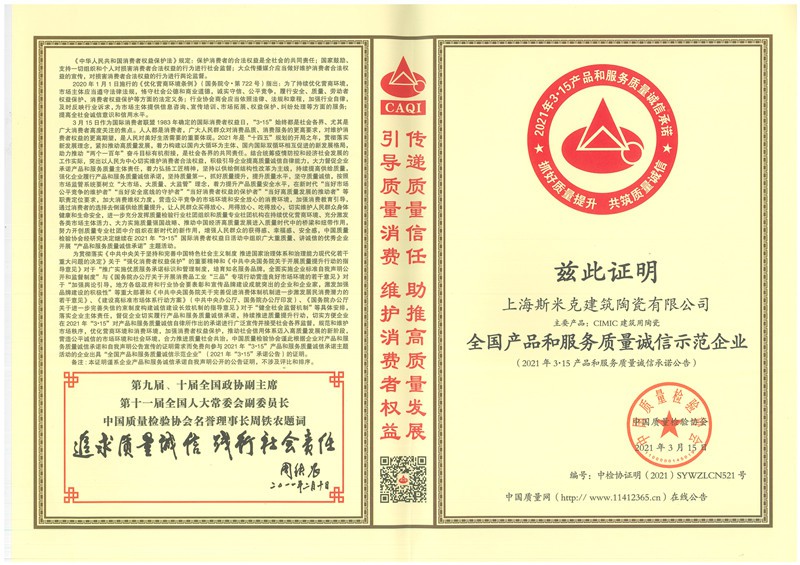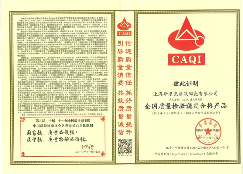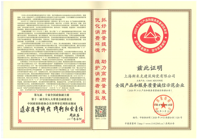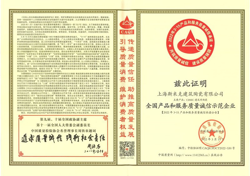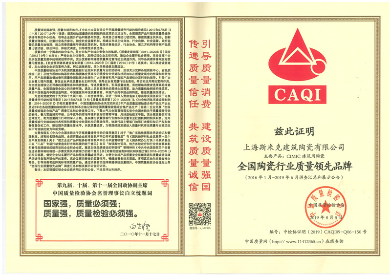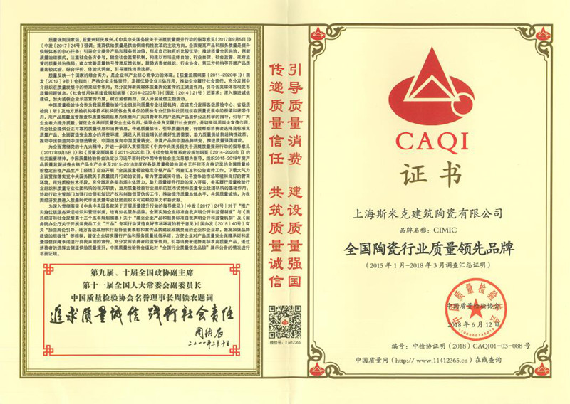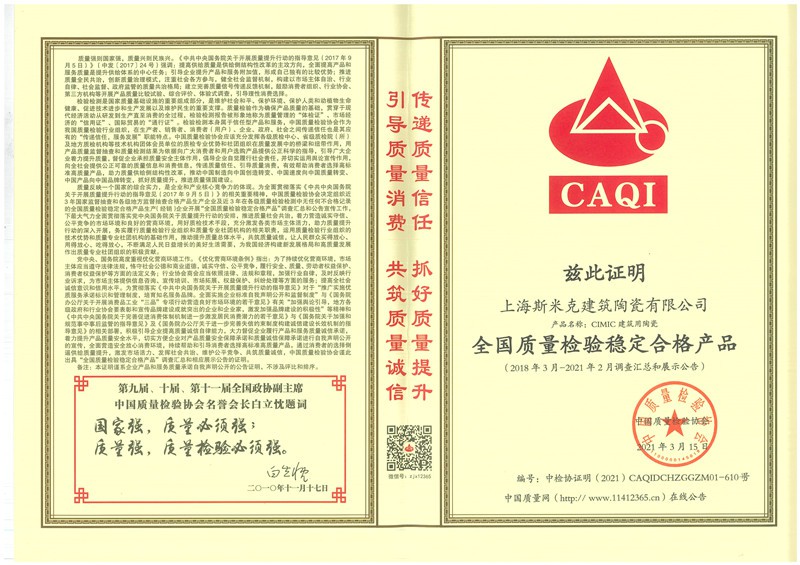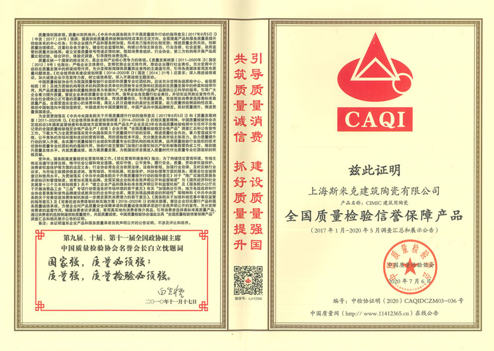 Aug  China Association for Quality Inspection’s “Product of Reliable Quality” certification, “National Ceramics Brof Distinction Superior Quality” certification, “National Ceramics Company of Distinction Superior Quality” certification