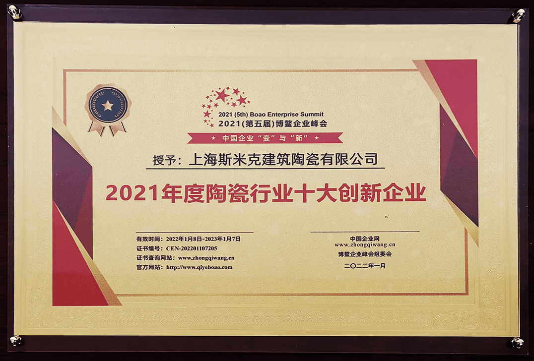 1月  獲第五屆博鼇企業峰會 “2021中國陶瓷行業十大創新企業” (有效期2022/1/8-2023/1/7)
