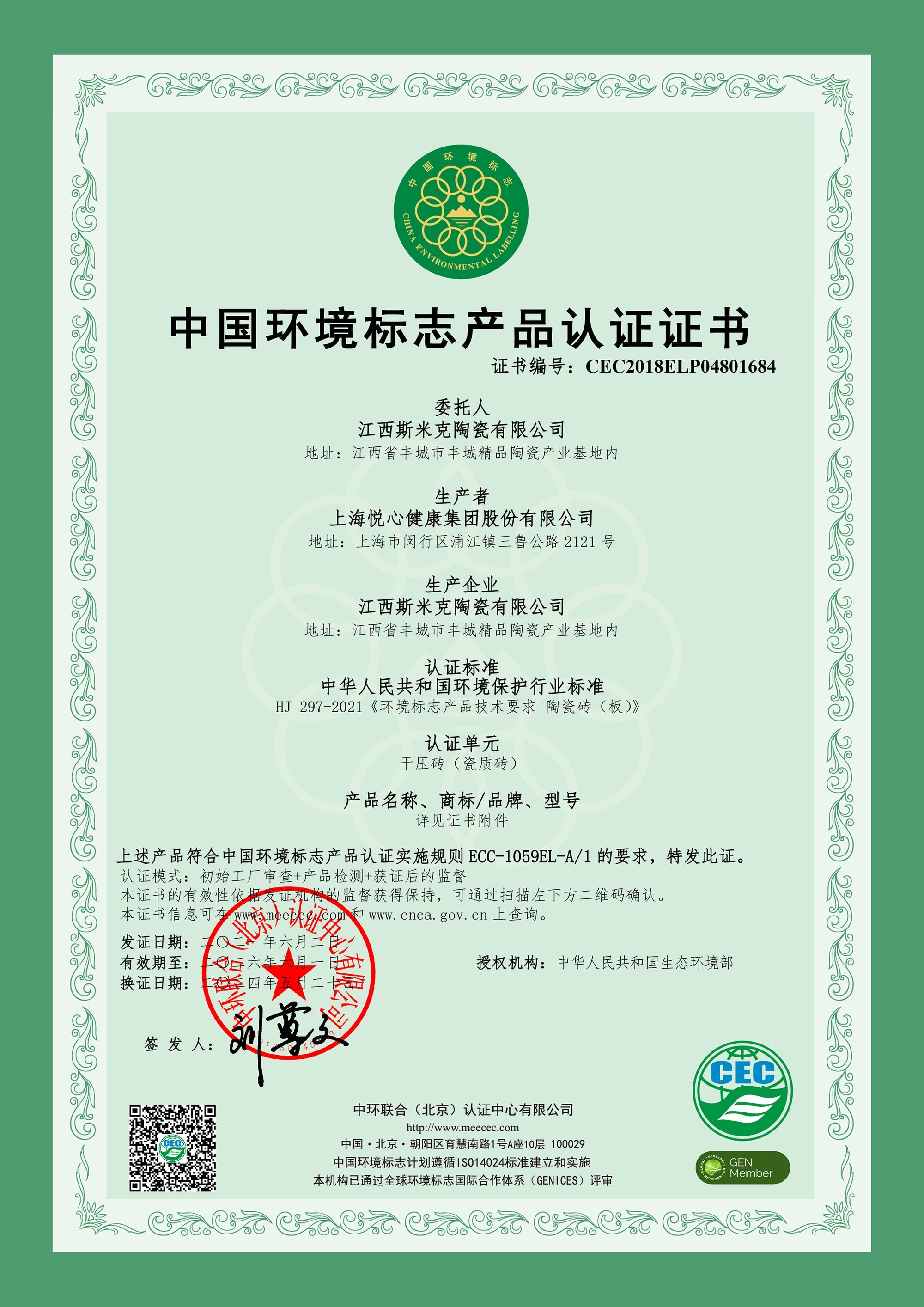 6月  獲中國建材檢驗認證集團股份有限公司(國檢集團)“中國綠色產品認證證書”(有效期至2026/6/9)