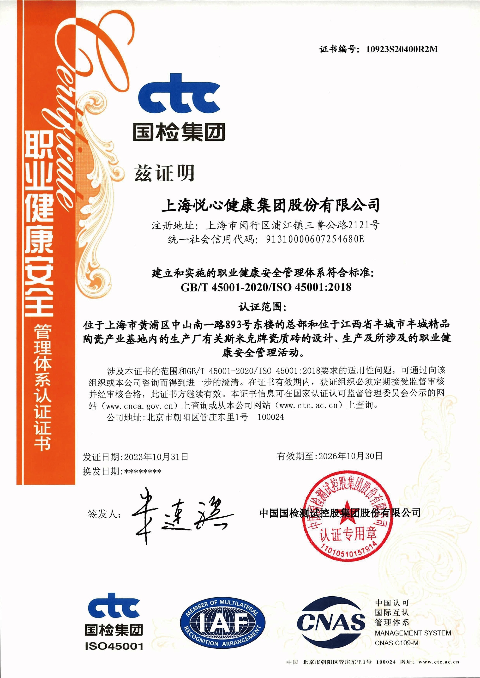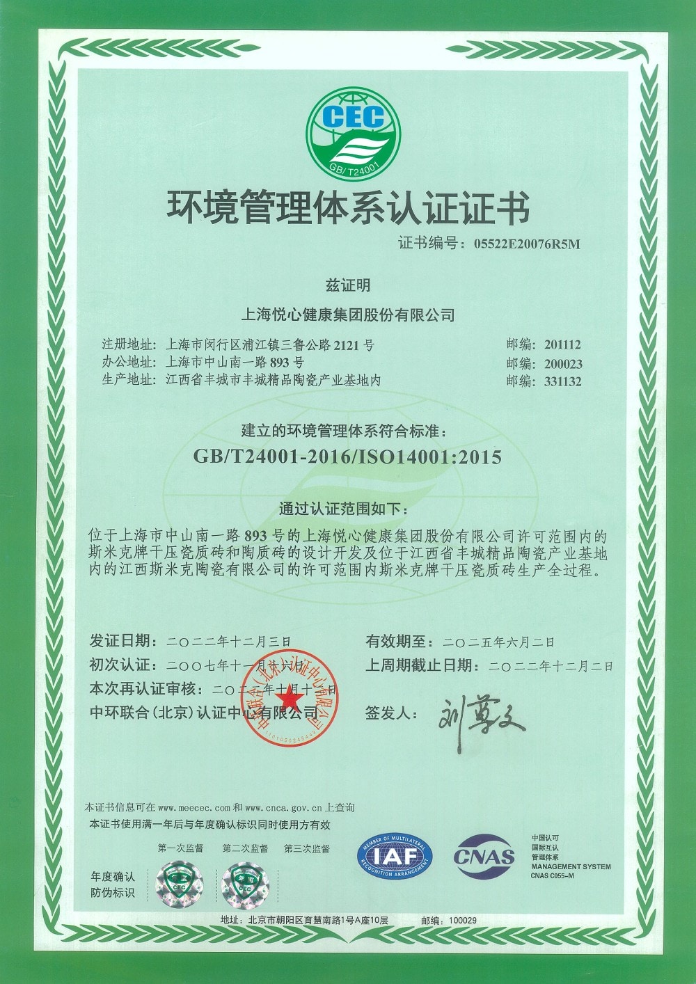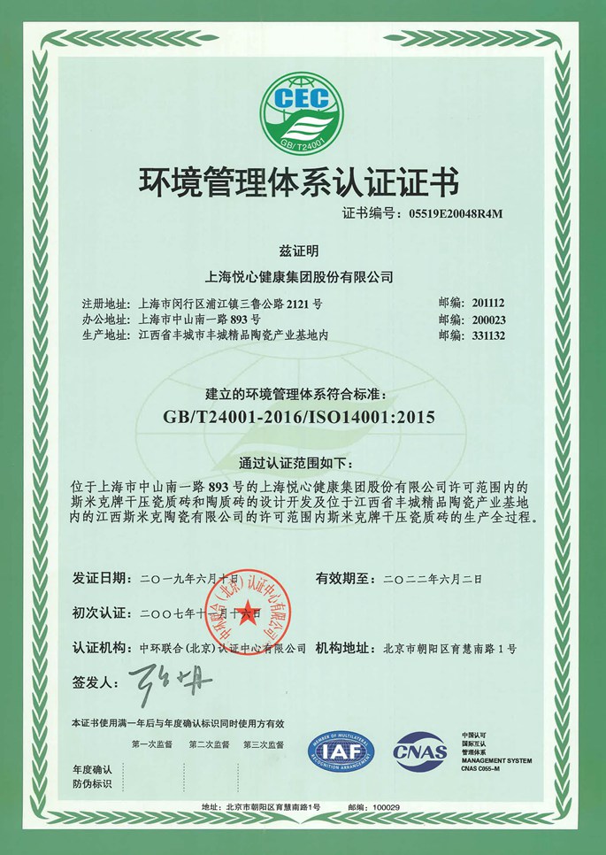 • 環境管理體係認證證書上海